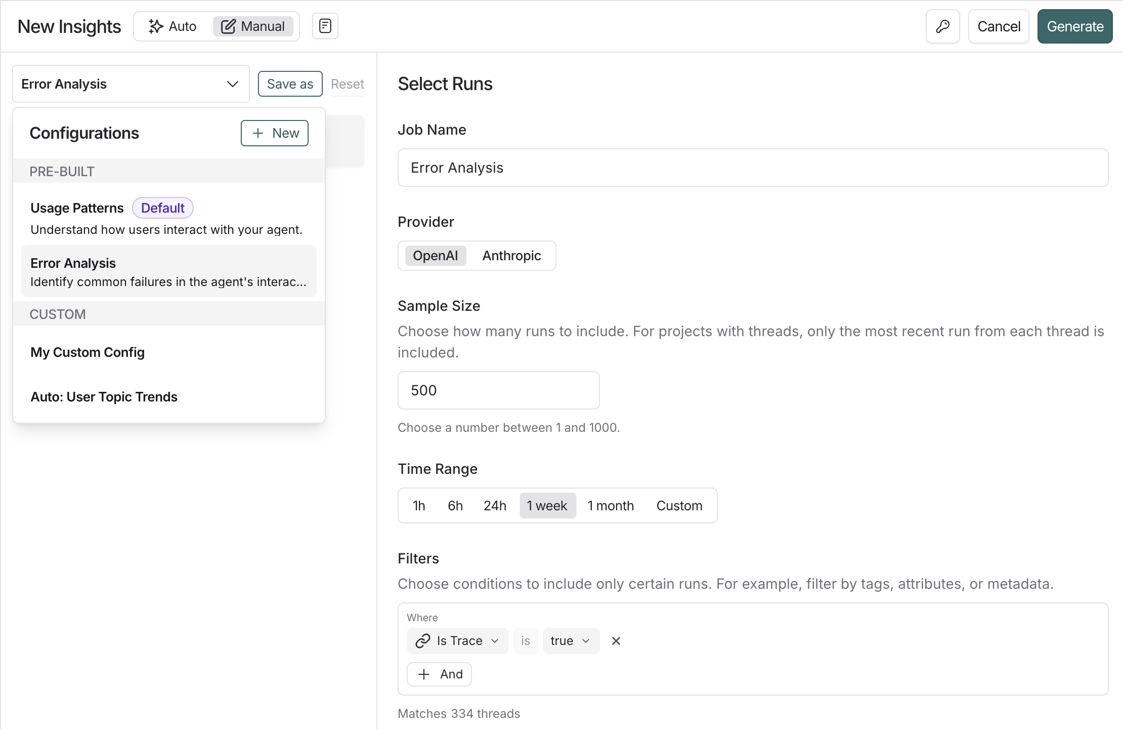 You can optionally save configs for future reuse using the ‘save as’ button. This is especially useful if you want to compare Insights Reports over time to identify changes in user and agent behavior. Select from previously saved configs in the dropdown in the top-left corner of the pane when creating a new Insights Report.Connect these docs to Claude, VSCode, and more via MCP for real-time answers.